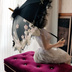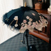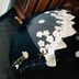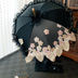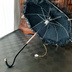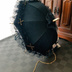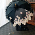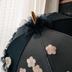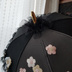 「紫水晶」と記載がある反物を使用しています。より深い黒を出すために、一度紫に染め黒くしているとのこと。 ノリタケの四季彩シリーズのカップを所持していますが、このコーヒーカップをイメージして作成しました。 8面のうち2面のみチュールレースをかぶせました。 角度によっては黒い面のみ撮影することができると思いますので、二面性があり面白いかと思い作成いたしました。 内側は黒のシフォン布と黒レースを重ねて仕上げています。 傘を開く際は、カーブを強く出しましたので、少し力が必要です。 中心のステンレスのパイプを持ってゆっくり開閉してください。 ハンドルだけを持ち開閉すると抜けてしまいます。 留め具は花型のパールビーズと花びらのチップを使用しました。