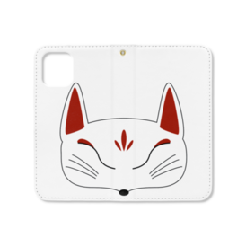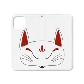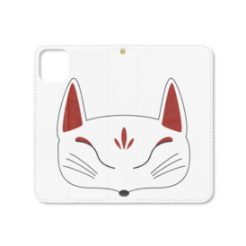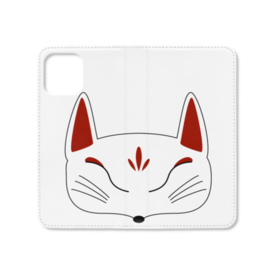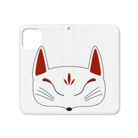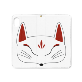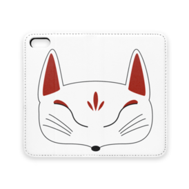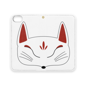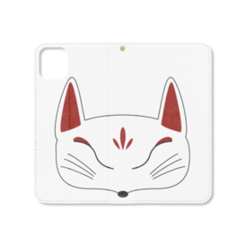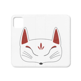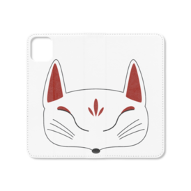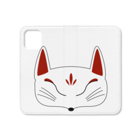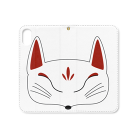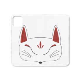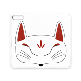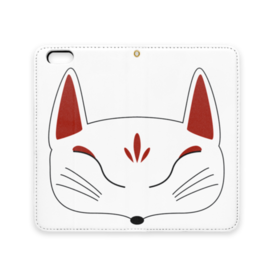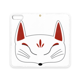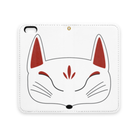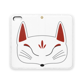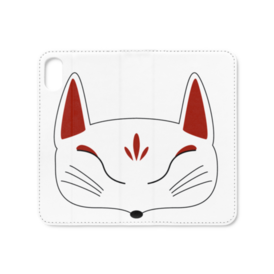 白狐面の手帳型iPhoneケース(ベルトなし)。 白狐面、赤狐面、黒狐面を販売中。