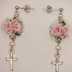 ご覧いただきましてありがとうございます。 樹脂粘土製のパーツ、パールビーズを使用したピアスです。 ピンクのバラと白ピンクのパールビーズを合わせて、可愛らしい色合いに仕上げました。 十字架チャームが耳元で揺れる、華やかさのあるデザインのピアスです。 ピアス金具はサージカルステンレス製のものを使用しています。 写真ではスタッドピアス(サージカルステンレス)でお仕立てしていますが、お好きなパーツへの変更も承ります。 ご希望のパーツを選択していただきますようお願いいたします。 サフィックス社のスウェットバリアを使用しての金属アレルギー対応も可能です。 ご希望の方は右のメニューより「金属アレルギー対策有」の項目を選んでください。 ※注意※ ☆お花のパーツは樹脂粘土でできています。性質上強い力や水濡れに弱いので、やさしいお取り扱いをお願い致します。 ☆定形外郵便でのお届けのみとなります。 【Size】 全長4cm ・ブーケ:1.5cm×1.3cm ・パールビーズ:4mm ・十字架チャーム:1.3cm×8mm