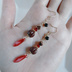 まるでチョコレートのような味わいある色をしているチェコメロンビーズに大人っぽいレッド色のチェコダガービーズをチェーンと一緒に合わせたシンプルなデザインながらもお洒落な揺れるタイプの作品になっております☆ メインのお色はいちご果汁とチョコレートをイメージしたシックなチョコレートとダークレッドの2色、ゴールド金具と合わせてどんな場面でもご着用しやすい大人お洒落な色合いにまとめました☆ アレルギー対応のピアスやイヤリングへの変更についてはご注文時にオプションよりご希望金具をお選び下さい☆ ※こんな方におすすめ♪ *大切な方へのプレゼントに *大人お洒落な色合いがお好きな方に *揺れるタイプの作品がお好きな方に ☆チェコメロンビーズ バーガンディブラウン 8mm ☆チェコダガービーズ バイカラーポメグラネート 16x5mm ☆ガラスビーズ フルコートブロンズ ボタンカット 6mm ☆ガラスビーズ レッド ボタンカット 4mm ☆チェコビーズ ジェット ラウンド型 4mm玉 ☆チェーン ゴールド ☆スペンサー ゴールド ☆座金 ゴールド ☆丸カン ☆三角カン ☆Tピン ☆9ピン ☆ピアス用金具(フック式☆ゴールド) 長さは約6.5cmとなっております。(約1cm程のピアス金具を含む)