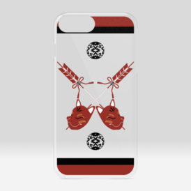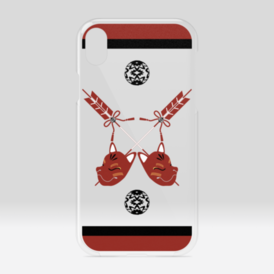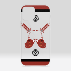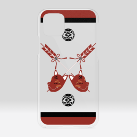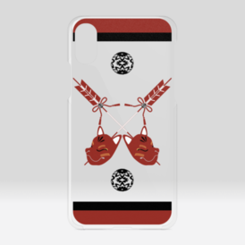 赤狐のお面 クリアiPhoneケース。 赤狐のお面と破魔矢のイラスト。