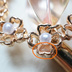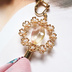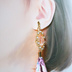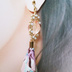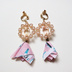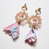 ピーチキャンディーのようなピンクとイエローの2色仕立てのアクリルビーズを、パールの付いたフラワーリースの中に下げ、ブルーが差し色の花柄の生地で作られたタッセルを添えたイヤリングです。 軽い材質を組んでおりますので、大ぶりモチーフもご負担少なくお楽しみいただけるかと思います。 ご着用いただくと、リースが横顔を彩る向きを向いて下がります。 パーツがちょうど1組分のみあり、その1組でお作りしました。 このため再販の予定はなく、イヤリング1組のみのご用意となります。 画像が現品です。 ピアスへの変更はお気軽にご相談ください。 耳たぶの後ろにあたる部分にゴムクッションをお付けします。 画像4~6枚目は、ほぼ実物大の人物の画像に添えました。 ◇ ◇ ◇ フラワーリースモチーフの透かし部分には、透明の樹脂で穴がふさがっている部分が1か所あります。 ほとんど目立たず、ご着用にも差し支えないと思われますが、あらかじめご了承ください。 プラスチックパールは表面に小さなくぼみや傷が見られる場合があります。 1点1点手作業で制作しておりますので、大きさ、形状は多少異なります。 繊細な作品ですので、丁寧なお取り扱いをお願いいたします。 材質:樹脂、金属、布 サイズ:縦約6.5cm×横約3cm(モチーフ部分)