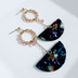 かなり大ぶりサイズのハーフラウンド型べっ甲風アクリルプレートをこれまたちょっと大きめサイズのツイストフープからチェーンで揺れるように合わせたユニークでお洒落な大ぶりサイズの作品となっております☆ まるで小宇宙を見ているかのようなブラックベースに様々な色合いが混ざり合ったべっ甲風アクリルプレートにそれぞれお星様をアクセントに合わせました☆ ゆらゆらとゆれるべっ甲風アクリルプレートをお楽しみ下さい☺ 耳元を華やかに魅せたい人におすすめの作品となっております☆ ※大ぶりサイズの作品ですのでピアス金具はポスト&キャッチ式となっておりますが、樹脂またはチタンピアスに変更のご希望の場合はポストタイプではなく、フックタイプへの変更となりますので、予めご了承頂きます様にお願い致します。 イヤリング金具へのご変更の場合はネジバネ式がおすすめです。 ☆ファイアポリッシュチェコビーズ スモーキーピンクオーロラ 4mm ☆べっ甲風アクリルプレート マルチカラー ハーフラウンド型 36x18mm ☆☆ツイストフープ ゴールド 15x15mm ☆お星様のパーツ ゴールド ☆チェーン ゴールド ☆丸カン ☆Tピン ☆ピアス用金具(ゴールド☆ポスト&下向き防止のキャッチ式) 長さは約6.5cm/幅は約3.5cmとなっております。(ピアス金具を含む)