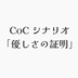 CoCシナリオ 【優しさの証明】 これは優しさから始まり優しさによって終幕を迎える物語。 生きていたければ自身の優しさを証明するほかない。 貴方の優しさはこの物語を終わらせるに足るものか? ▪概要 1PL専用 ※“心の優しい”探索者限定シナリオ 推奨技能:目星 ロスト率:低 後遺症:確定あり セッション時間:ボイセ2時間ほど ※本シナリオは鬱展開を含みます。 ・2023/06/24 一部加筆 ▪注意事項 公の場でのエンディングタイトルの公開禁止。 シナリオの二次配布、二次利用は禁止です。 動画化など大歓迎ですが、シナリオ本文内に記載の注意事項を必ず守ってください。 注意事項が守られない場合は予告無くシナリオ公開停止などの処置を取らせていただきます。 本作は、「 株式会社アークライト」及び「株式会社KADOKAWA」が権利を有する『クトゥルフ神話TRPG』の二次創作物です。 Call of Cthulhu is copyright ©1981, 2015, 2019 by Chaosium Inc. ;all rights reserved. Arranged by Arclight Inc. Call of Cthulhu is a registered trademark of Chaosium Inc. PUBLISHED BY KADOKAWA CORPORATION