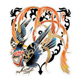 カラスの王様はイソップ童話のひとつ『鳥の王様選び』『おしゃれなからす』『王様になりたかったカラス』などのタイトルで親しまれているお話で、鳥の王様を決めるときにカラスがほかの鳥の羽を沢山羽に差して王様になろうとした、というもの。いざ王様に決まりそうになった時にほかの鳥たちに全部挿し羽を引き抜かれてただの黒い鳥になってしまいました、という、「上っ面だけでは意味がない」「嘘は必ず暴かれる」という寓話なのですが、私はこの話が大好き。 他の鳥の羽をきれいに飾ろうと考えたカラスの頭の良さ、着飾ることで自信を得ようとしたいじましさ。 それもまた努力だし、才能だったと思う。 少し可哀そうなお話なのも、好きなところ。 そして、カラスというと古くから太陽と強く結びついた鳥でもあります。太陽の黒点をカラスと見立てて、カラスが太陽を背に乗せて運んでいる、カラスが太陽のお供をしている、とされています。 日本でも、カラスは中国での扶桑伝説※を受けて、太陽とよく結びつく鳥です。三本足のカラス、三足烏(さんそくう)は八咫烏とも結びつき、神使となり神武天皇の道案内も務めたことから進むべき道を示す鳥ともなっています。 (三本の足は、天・地・人、朝日・昼日・夕日を示すなど、様々にとらえられているようです。) 今回はこの三足烏の様々な呼び名の中から金烏(きんう)を選びました。金色の羽を挿した、太陽の烏です。 そしてわかる人には分かる、FGOの岡田以蔵のモチーフを組み込んだ金烏としても描き上げました。(私が欲しかったのです!)まっこと恰好えい羽織袴と、第三再臨の衣装を多く踏襲しました。友達が以蔵さんの目を「太陽のような眼」と言ったのがきっかけでもあり、ラフを見せたときに別の友達から金烏だね!と言われたのも決定打でした。(ありがとう!!) 見栄っ張りでお洒落が好きなFGO以蔵さんとこのモチーフはぴったりだと思います。同じように以蔵さんが好きな人にも喜んでもらえますように…! ※金烏(きんう) 太陽に居る金烏(きんう)、月に居る玉兎(ぎょくと)などと並べられることの多い、太陽に居る烏。 赤烏、黒烏、陽烏などとも。 古く中国の伝説に端を欲し(山海経など)日本にもわたってきて、天皇の衣装などにも用いられています。 https://ja.wikipedia.org/wiki/%E9%87%91%E7%83%8F wiki 金烏 (金烏玉兎、と並べると月日となり、時間をも意味しますが、安倍晴明の編纂したと伝わる呪術書の名前でもありますね!内伝金烏玉兎集) ※扶桑(ふそう)伝説 中国の古い神話で、海のかなたには扶桑と言う聖なる巨木があり、その枝には10個の太陽と1三足烏が休んでいます。毎日太陽は烏の背に乗り空を渡り、渡り終えると水浴びをして木に休みます。そうやって10個の太陽がかわりばんこに空を渡るのです。(烏の数は1羽なのか10羽なのか…) 扶桑はやがて、中国から見て東にあるので日本の異称ともなり、日本でもそれを受けて自国を扶桑と呼ぶことがあります(平安時代より) https://ja.wikipedia.org/wiki/%E6%89%B6%E6%A1%91 扶桑のwikiです。面白いです。