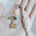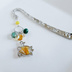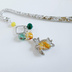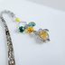 幸せを呼ぶと言われているウミガメさん(ホヌさん)の小さめのレジン枠をイエロー色の藻や星砂入り蓄光パウダー、マーメイドホログラム、金箔風ホイルフレークなどをUVレジン液で封入してオリジナルパーツに仕上げました。 そのホヌさんとビーズをジャラジャラと合わせたスクエアフープなどを合わせたお洒落な文庫本サイズのブックマーク/しおりとなっております☆ メインのお色は自然を感じさせるグリーンとイエロー色の2色、シルバー金具と合わせてまるでさざ波の音が聞こえてきそうな爽やかな色合いにまとめました☆ ブックマーク本体のサイズはおおよそ8cm程となりますので、特に小さめサイズの文庫本やページ数があまり多くない単行本などに挟むとぴったりのサイズだと思います♪ ホヌさんのレジン枠の内側部分はUVレジンを使用してすべて手作りで作っておりますので、まったく同じ色合い、デザインでのパーツは新たに作る事は出来ません、よって写真の作品はこちら1点のみとなり、世界で一つだけの作品になります。 (※似ている色合いで再度作る場合は御座います) ホヌさんのモチーフがお好きな方に特にぴったりの作品となっております☆ ※こんな方におすすめ♪ *大切な方へのプレゼントに *ホヌさんのモチーフがお好きな方に *レジン作品がお好きな方に *読書好きな方に ☆ホヌさんのレジン枠 約1.5cm (イエロー色の藻、薄パープル色のマーメイドホログラム、クリアホワイト色のラメ、金箔風ホイルフレーク、星砂入り蓄光パウダー、蓄光サンドをUVレジン液と一緒に☆) ☆チェコビーズ アクアマリンピカソ オーバルテーブルカット 8x6mm ☆ファイアポリッシュチェコビーズ トパーズAB 6mm ☆ガラスビーズ オペークティールグリーン ボタンカット 6mm ☆チェコビーズ シャンパンラスター ラウンド型 4mm玉 ☆ガラスビーズ オペークイエロー ボタンカット 4mm ☆スクエアフープ ☆丸カン ☆9ピン ☆Tピン ☆ブックマークパーツ(シルバー) 長さは約8cmとなっております。 パーツ部分の長さは約5.5cmとなっております。 ※直射日光に当たり続けると色が変色または薄くなる場合が御座いますので、出来るだけ日光が当たらない所で保管して頂きますようにお願い致します。 (また箱の中や袋に入れて頂くだけでも変色を少しでも抑える事が出来ます。)