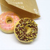 1/3~1/4ドール用サイズくらいのドーナツを作りました。 ■セット内容 ①いちごドーナツセット ドーナツ1個、おまけの袋1枚 ②チョコドーナツセット ドーナツ1個、おまけの袋1枚 ■サイズ ドーナツ:直径21~23mm 厚さ:約10mm 袋:約35mm×35mm ■注意事項 ※絵具、ニス等を使って着色してあります。環境によってドールへと色移りやニスが付く可能性がありますので、長期間持たせたりするなどはお避け下さい。 ※チョコドーナツについているナッツですが、しっかりと付けてはありますが、袋に当たったり、引っかいたりした場合、取れる可能性がありますので、取り扱いには十分お気を付けください。 ※袋の柄は全て異なります。選ぶことはできません。 ※素人の作品となりますので、同じサイズで作れるように努力はしておりますが、個々で多少サイズ等が異なる場合があります。市販と同じものをお求め希望の方は購入をおやめください。 ※写真を見ていただいている環境により、商品の色が実物と異なって見える場合もありますので、ご了承ください。