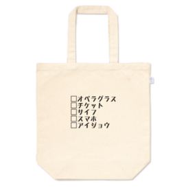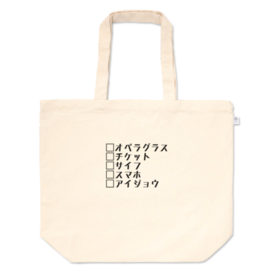 トートバッグ - M - プリント面積小この商品はpixivFACTORYで作られた商品です。サンプル画像は完成イメージのため、実物と異なる場合があります。 観劇やコンサートなど、重要な推し活に欠かせない持ち物をトートバッグにリストアップしました! これさえあれば安心してイベントを楽しめる……かも。