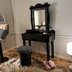 1/3(1/4)スケール ドール用 ミラードレッサー ゴシックブラック [セット内容] ミラードレッサー本体 (サイズは画像参照) 椅子 こちらの家具は本体の奥行きが狭い形状をしておりますので、転倒防止を防ぐためできるだけ壁に寄せて飾ることをおすすめします。 ※全て新規造形に無垢材や集成材などを使用。耐水水性塗料による塗装仕上げの関係で、表面処理やディテールの荒さが少し目立つ箇所があります。 こちらは当方のハンドメイド品になります。 本職の内装業で余った物、実際に使われてる建築部材(合板や樹脂材、ダイノックシートなど)を使用しております。 基本的に耐久性のあるシート施工をしておりますが、形状が複雑なものはサイズが小さい為、シート貼りではなく塗装仕様となります。パテ処理やジョイント接続によるムラが多少ございますのでご了承下さい。また、怪我のないようできる限り鋭利な箇所はフラットに丸みを出しておりますが、取扱いお気をつけ下さい。塗装やプライマーによる臭いはできる限り低減して処理してますが、無臭になるのにはお日にちかかる場合がございます。 グルーガン接着時に出た蜘蛛の糸のようなものが付着している場合がありますが、テープや濡れたタオルなどで拭き取れます。 奥行きが浅い形状ですので、飾る際は壁に立て掛けるか脚に粘着テープなどで固定することをおすすめ致します。 各ドール様を家具に触れさせたり座らせる際は、念のため色移りがしないようにカバーをしたり、撮影時以外は触れさせないようにするなど対策されることをお勧め致します。 ☆MDDとDDPなどに丁度よいサイズです (写真はMDDモデルと撮影したものです) ※ドールは付属しません ※ハンドメイドにつき、傷や汚れなど過剰に気にされる方はご遠慮下さい