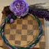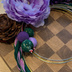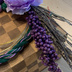 しめ縄本体は水引の深緑・藤・金を使い編み込みました。飾りに使っているのは紫の実物と紫稲、紫の花は造花のラナンキュラス、茶色はヒマラヤスギのシダーローズです。