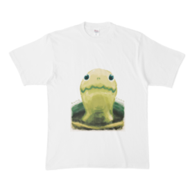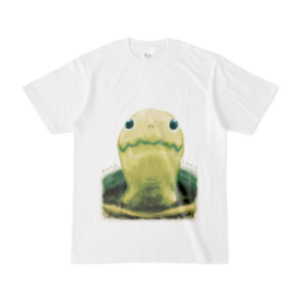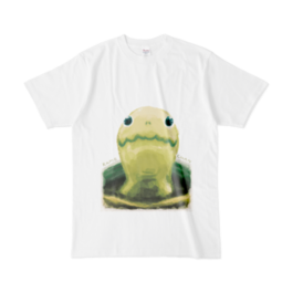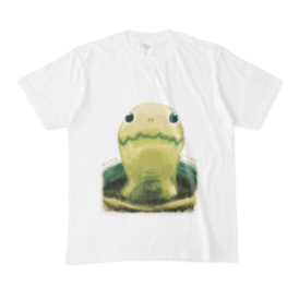 Tシャツ - XL - 白ニュッと顔を出している亀ちゃんのTシャツです。 背中側は甲羅から尻尾と後ろ足を恐る恐る出している所です。 この商品はpixivFACTORYで作られた商品です。サンプル画像は完成イメージのため、実物と異なる場合があります。