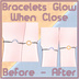 The bracelets come with an FX layer that will allow the Charms to glow when close, the hierarchy needs to be set up correctly or else it wont work, I recommend double checking the FX layer once you have it set up on an avatar, to merge the FX layer to your own use the Avatar Manager addon in the Creator Companion.