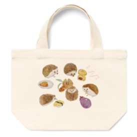 トートバッグ - M - プリント面積中はりねずみのイラストが描かれたトートバッグです。 はり坊と××シリーズ。 いろんなポーズのはり坊と、似ている食べ物たち。