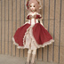 上品な”赤”を厳選し、シボ入りのシフォン生地を円形スカートにしました。 裾に金色のブレードを叩き、フリルたっぷりのカフスはフィンランドで仕入れたビーズ付きのベルベット生地で締まりよくまとめました。 ボンネットに金色のリボン(※画像4枚目が実物のお色味になります。)と苺モチーフの飾りを3つ付け、ドレスに負けないバランスに仕上げました。 パニエとチョーカー、ソックスは他のお洋服にも合わせやすいお色味を選びました。 ★カフスは腕にぴったりのサイズで制作いたしました。ドールのハンドパーツをはずして頂き、あおむけに寝かせて腕をボディに対して垂直に上げた状態で通すと着せやすくなっております。