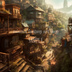 ファンタジー世界の山間にある街-背景素材