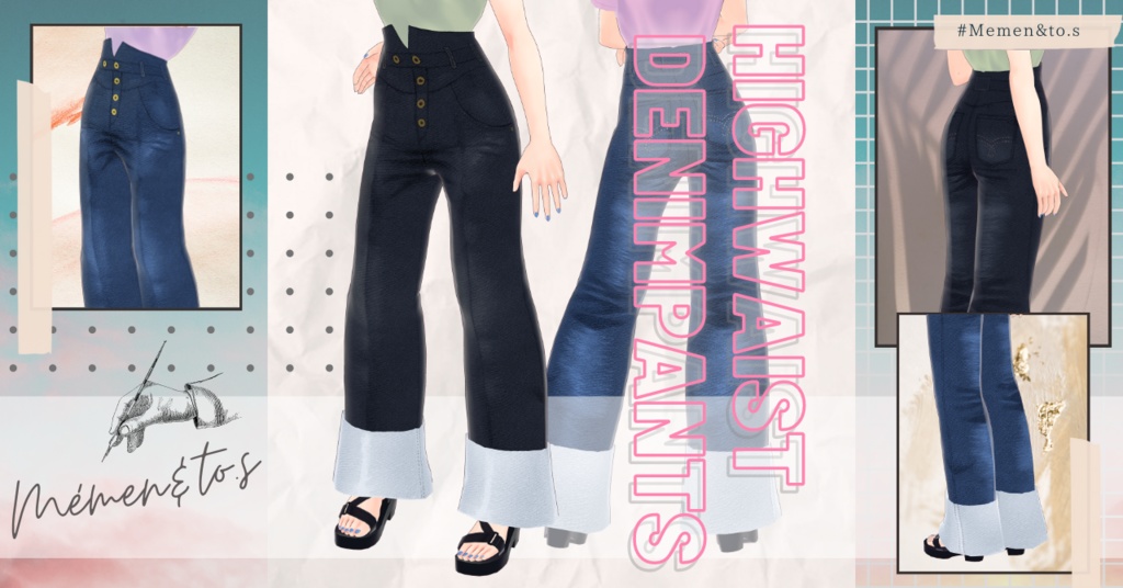 :::::::::::::::::::::::::::: 【VRoid正式版】ハイウエストデニム&ノベルティTシャツ :::::::::::::::::::::::::::: VRoid用のハイウエストデニム&ノベルティTシャツのセット 無料版はワンカラー(ブルーデニム)、 有料版にはそれぞれのカラーとTシャツが同梱されています ※各パラメーター、シェーダーカラーの変更OKです※ ご利用にあたっては、以下の利用規約をご確認ください ◆利用規約 ・クレジット表記は任意です 使用した際はハッシュタグ「#Memen_tosv_v」をつけて ツイートしていただけるとよろこびます ・著作権は放棄しません ・商用個人問わず利用OK ・自作発言、再配布・販売は禁止です