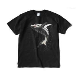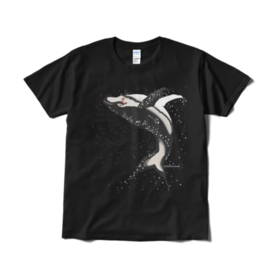Tシャツ(短納期) - XL - ブラックこの商品はpixivFACTORYで作られた商品です。サンプル画像は完成イメージのため、実物と異なる場合があります。 大好きな国芳の鯨をベースに、ポーズやボディラインをアレンジして、図案を起こしました。 (歌川国芳の「宮本武蔵の鯨退治」本当に素敵な浮世絵なのでぜひ検索してみてください) 黒鯨-星図-は、日本で古代に用いられていたキトラ天文図から起こした星図を重ねています。 ファクトリー製Tシャツは男女兼用Tシャツなので、女性はちょうど二の腕が隠れるくらいの長めの半そでに、お尻が隠れる程度の少し長めの裾になり、それがなんとなく着やせして見える、よい形のTシャツで、とても気に入っています。 (実際の着用写真や、注意事項を簡単にまとめました! ご購入前に確認いただけますと嬉しいです) https://urahanabi.booth.pm/items/4893297 一年着倒して、がんがん洗濯機で回しても伸びたりせず、生地傷みはありませんが、プリント部分は細かくひび割れ、少しけば立ったような感じになります。エイジング加工のようで私はそれもいい感じだなと思って着ていますが、気になる方はいらっしゃるかもしれません。 もっと良い印刷のTシャツもファクトリー製にはあるのですが、値段が高くなってしまうので、もし欲しい方はツイッター、@urahanabiまでご連絡ください。別途登録いたします。