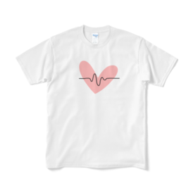 中央に大きなハートと鼓動を描いたシンプルでカジュアルなTシャツになっております。 ボトムスにインしてもデザインが隠れることなく着ていただけるかと思います。(念のためサイズのご確認をお願いいたします) 左胸に小さくプリントされたデザインもございます。 この商品はpixivFACTORYで作られた商品です。サンプル画像は完成イメージのため、実物と異なる場合があります。