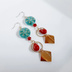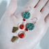 とても可愛らしい模様が施されたコイン型のアンティーク風アクリルビーズをメインにぷっくり可愛い赤色のしずくビーズが真ん中で揺れるサークルフープと少しひねりが入ったようなフォルムが素敵なスクエア型のメタルプレートを合わせたお洒落なピアス/イヤリングとなっております☺ メインのお色はちょっと気に早いクリスマスをイメージしたグリーンとレッド色の2色、ゴールド金具と合わせて大人っぽい色合いでまとめました♪ 揺れるタイプのデザインがお好きな方や図形モチーフがお好きな方に特におすすめの作品となっております♪ アレルギー対応ピアス金具、またはイヤリング金具をご希望の方はご購入時にオプションよりお選び下さい。 ※こんな方におすすめ♪ *大切な方へのプレゼントに *ゴールド金具を使用した作品がお好きな方に *クリスマスカラーがお好きな方に *揺れるタイプのデザインがお好きな方に ☆星と三日月型アクリルビーズ ブルーグリーン コイン型 約13mm ☆しずく型チェコビーズ ブリック・オペーク 9x6mm ☆ガラスビーズ レッド ボタンカット 4mm ☆サークルフープ ゴールド ☆メタルプレート ゴールド 歪み加工 スクエア 約10mm ☆スペンサー ゴールド ☆9ピン ☆丸カン ☆ピアス用金具(フック式☆ゴールド) 長さは約6.5cmとなっております。(1cm程のピアス金具を含む)