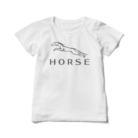 レディースTシャツ - L - 白躍動感あふれる馬の姿を、高級車のエンブレム風にデザインしました この商品はpixivFACTORYで作られた商品です。サンプル画像は完成イメージのため、実物と異なる場合があります。