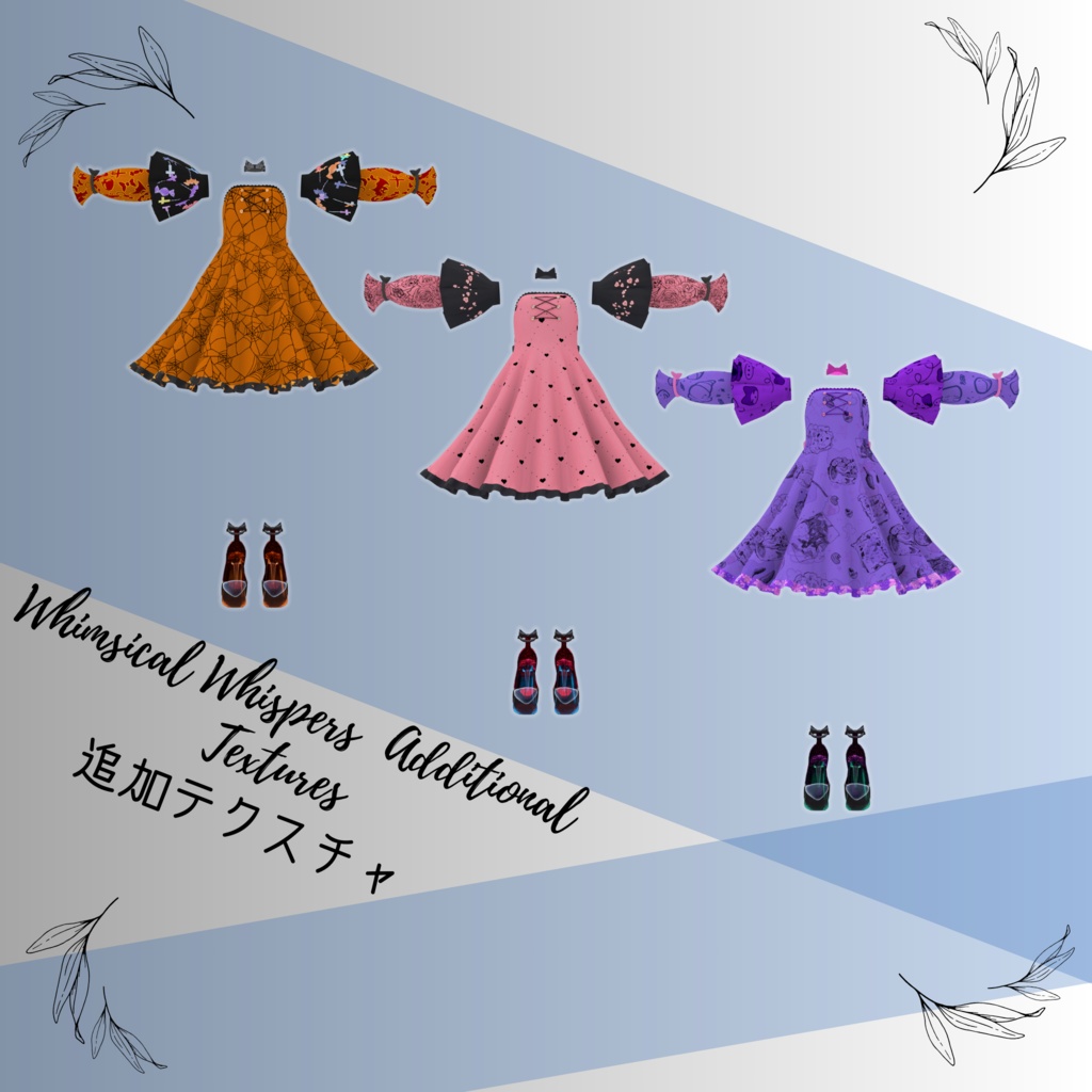 🎊年末セール🎊 2023/12/31~2024/1/1 の期間中に半額します~🎉 🎉開店セール/Opening Sale🎉 2023/10/19~10/22 の期間中にショップ開店、割引します~🌟 フルテクスチャパック ・1200円 → 1000円 各テクスチャ ・600円 → 500円 こちらの商品はWhimsical Whisperの追加テクスチャのみのでドレスのご購入はこちらのリンクへ~ https://mayune.booth.pm/items/5122344 Whimsical Whispersの追加テクスチャとして3つバリエを用意しました。 特にピンク柄は何人から評判が良くて販売商品として開始しました。 さらにハロウィンに伴ってハロウィンのテクスチャも作りました ✨内容物/Package Contents✨ 圧縮したZip └mat & tex ✨導入方法/Installation Method✨ mat & tex中のすべてのファイルをwhimsical whispersの同名のフォルダ内に入れてください。 liltoonシェーダー(1.4.1)をインポートしてください。 https://lilxyzw.booth.pm/items/3087170 ‼️更新履歴/Updates‼️ 2023/10/19 公開 ✨注意事項/Notes✨ ⚠️PhysBoneを使用しています。 PhysBone is used. 動作環境はUnity 2019.4.31f1を基準としています。 それ以外の動作は保証いたしかねます。 Currently Unity 2019.4.31f1 is supported. Unless otherwise stated other Unity versions are NOT supported. ✨利用規約/Terms of Use✨ 基本はアバターの利用規約がベースになります。 The basic terms of use follows the avatar's. 個人利用は全面的に私の個別の許諾なく行って構いません。 Permission isn't required for Private use. 商用/法人利用については、アバターを含む場合 まずはアバター作者様に許諾をいただいた上で当方にご連絡ください。 When used for commercial/ corporate, Kindly ensure permission is obtained from the avatar creator before contacting us for the terms of use ✨禁止事項/Strictly Prohibited✨ ⚠️未購入者へのデータ譲渡 Transferring data to those who have not purchased. ⚠️二次配布 Secondary distribution ⚠️政治活動・宗教活動を行う際に着用すること Political and/or religion use ⚠️Publicアップロード Public Uploads ✨免責事項/Disclaimer✨ 本データを使用して発生したいかなる損害・損失・その他不利益等には、 製作者は一切の責任を負いません。 Under NO circumstances shall Ascension Boutique be liable for any damage, loss, disadvantage, caused due to the misuse of data.