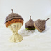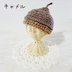 ウール100%の糸で編んだどんぐりの帽子です。 いわゆるどんぐり帽子よりもっと本物に近いものを作りたくて、色も形もこだわりました。 どんぐりは色々と種類がありますが、帽子の部分(正式名称は殻斗<かくと>と言うそうです。)に輪の縁があるタイプをモチーフにしています。 まっすぐでも斜めでもどちらでも被れる仕様です。 10~12cmぬいちゃん用のサイズです。 着用画像の頭囲18cmのぬいちゃんで、ほぼピッタリなサイズ感です。 頭囲17~20cmまで着用確認済み。 伸縮性があるため、斜めに被せる場合はもう少し大きい子も被れそうです。