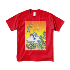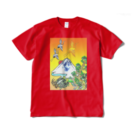 Tシャツ(短納期) - XL - レッドこんにちわ、希望と元気!Happy祈願のハッピスです。 縁起の良い目出度い「松に初日富士」に「親子鶴亀」の祝い重なりの構図柄です。 着衣模様は潜在心理的にも影響を及ぼしますので祝開運の気分や雰囲気のイメージUPにももってこいです。 この目出度い構図柄は潜在的に祝”縁起力の気分も高揚させます。 図柄は縁起の良い「初日の出の白富士」の手前に松を配置し、 左側には「鶴は千年・亀は万年」健康長寿も目出度い「飛翔黄金鶴親子」と「緑亀親子」を上下に配置したものです。 「祝”縁起」重なりの落ち着いたあでやかな構図/柄です。 是非、幸運と縁起の良さを訴求祈願して良縁開運を招き入れて下さい。 一着在るだけで祝”開運招福の雰囲気自覚の高揚にもなります。 実用を兼ねた縁起癒しグッズの演出物です。 「開運縁起力」の幸運を招き入れて希望、元気の高揚感を楽しむのは如何でしょう。 吊り下げて置くだけでも開運招福の縁起力、雰囲気を高揚させるお飾りにもなるでしょう。 「開運招福祈願」と実用を兼ねた縁起グッズとして如何でしょうか。 この商品はpixivFACTORYで作られ其処から発送される商品です。 イメージ写真です。 発送はpixivFACTORYからとなりますので一部商品を除き16営業日以内に発送されます。