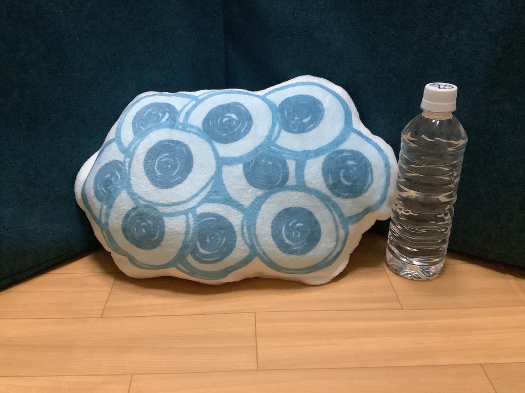 ふかふかクッション - 中(H36×W56cm) - 片面起毛素材のふかふかクッションです。 画像1と2の一緒に写っている500MLペットボトルをサイズの参考にしてください。 ※ペットボトルは商品に含まれません。 起毛素材にイラストをプリントしているので逆撫でると、 画像3のようにまだらになりますが、これは個性です! 卵塊がふかふかのクッションです。 ふかふかの卵塊に顔を埋める…ロマンですね✨ この卵たちの中から可愛いのが飛び出してくるのですよ。 最高です!LOVE卵塊!!