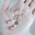 ストライプ模様がうっすらと入ったピーチ色が可愛いちょっと大きめサイズのファイアポリッシュチェコビーズにぷっくり可愛いしずくビーズが中で揺れるシャープなオーバルフープや可愛い四葉のクローバーのパーツなどを合わせたお洒落なピアス/イヤリングとなっております☆ メインのお色は美味しそうな桃をイメージしたピンクピーチ色、ゴールド金具と合わせて可憐で可愛らしい色合いでまとめました☆ ピーチやピンク、ゴールド色がお好きな方にはもちろんやシャープなデザインや揺れるタイプのデザインがお好きな方に特におすすめの作品となっております☆ アレルギー対応のピアスやイヤリングへの変更についてはご注文時にオプションよりご希望金具をお選び下さい ※こんな方におすすめ♪ *大切な方へのプレゼントに *優しい色合いがお好きな方に *四葉のクローバーモチーフがお好きな方に *揺れるタイプの作品がお好きな方に ☆ファイアポリッシュチェコビーズ クリア 不透明ピンクストライプ 8mm ☆ガラスビーズ オパールホワイト ボタンカット 4mm ☆しずく型チェコビーズ ロザリンピンクマット オパール 9x6mm ☆オーバルフープ ゴールド ☆四葉のクローバーパーツ ゴールド ☆三角カン ☆丸カン ☆Tピン ☆ピアス用金具(フック式☆ゴールド) 長さは約5.5cmとなっております。(約1cm程のピアス金具を含む)