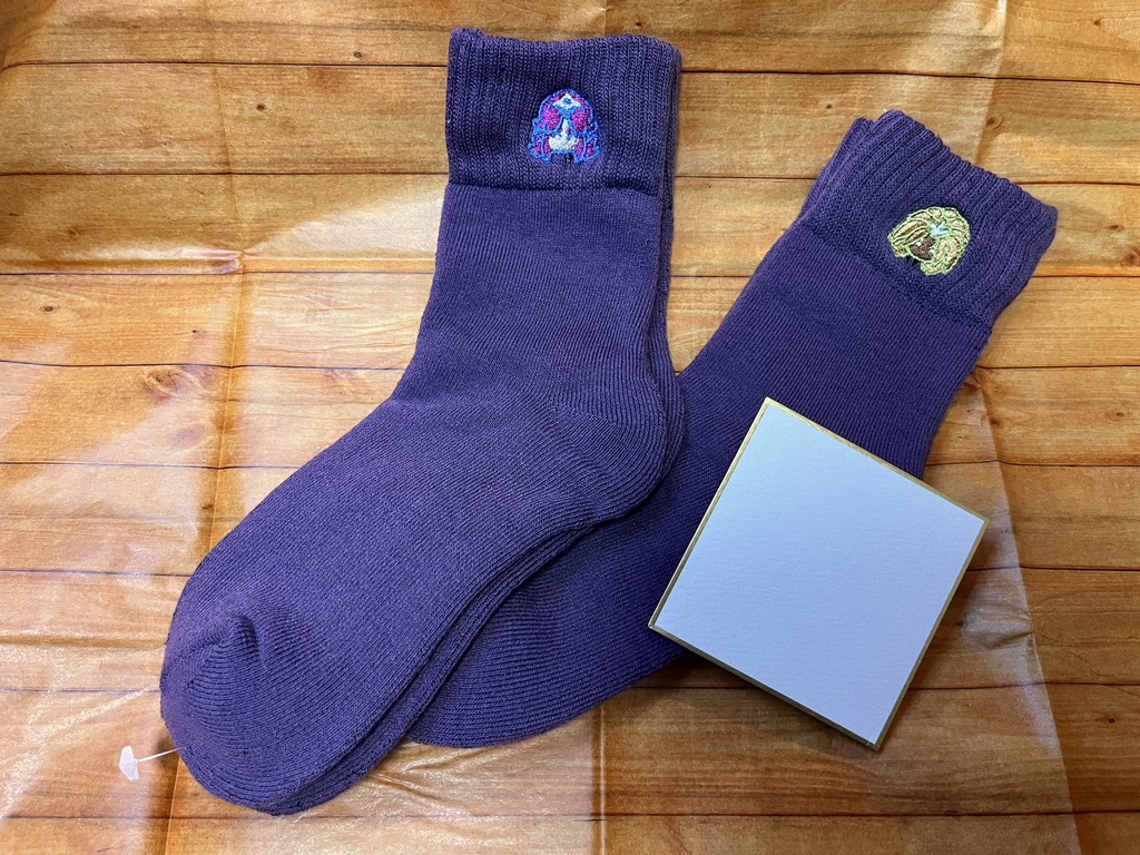 アンジェラとデュランのデォルメお顔を靴下に刺繍したものです。 子午線の祭開催記念としてアンジェラを描いた豆色紙をお付けいたします。 また、デュランが入稿ミスによりモールベアと化しております。 こちらはアウトレット価格での頒布、アンジェラと一緒にお迎えくださるお礼としてモールベアデュランとアンジェラを描いた豆色紙をお付けいたします。 豆色紙はどちらも作成次第追記いたします。 (サイズ:7.6㎝×7.6㎝、固形絵の具で作画予定) 色:ライラック サイズ: 刺しゅう部分最大3cm×3cm 靴下23~26cm ※フリーサイズのため個体差があります 商品の仕様について(※おたクラブ様の商品ページを元に記載しております) ・洗濯をする場合は、手洗いを推奨いたします。 ・ほつれ防止のため、刺しゅう裏側に出ている糸はある程度残った状態でのお渡しとなります。 製品の詳細はこちらをご確認くださいませ。 おたクラブ様の商品ページ[https://otaclub.jp/products/category2/embroidery_item/embroidery_sox/]