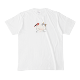 Tシャツ - XL - 白佐渡を代表する鳥といえば朱鷺! そのトキとことわざを掛けた、ゆるく親しみやすいキャラクターにしてみました。 苦しいトキの神頼み…普段は宗教に信仰心を持たない人が、病気や災難などで困ったトキにだけ神仏に祈って助けを求めようとすること。