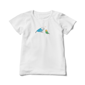 レディースTシャツ - L - 白オモチャのインコと見つめ合うセキセイインコ♪ 消しゴムハンコで描いたイラストです。 手描きの風合いになります。 この商品はpixivFACTORYで作られた商品です。サンプル画像は完成イメージのため、実物と異なる場合があります。