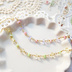 春の花畑 ナゲット型のベネチアンガラスとスペーサー型のフランスヴィンテージガラスをつなげて、 愛らしく。 藤桜と菜の花のイメージ。 春の装いにぴったりのアクセサリー。 ふわっとブラウスやワンピースに。 MDD~DDサイズ 約10cm+アジャスター ナゲット型(ベネチアンガラス):5mm スペーサー型(フランスヴィンテージガラス):3mm アジャスターの先には同色スペーサー型ビーズを使用。 金具:ゴールドカラー(メッキ) ※ネックレス部分のサイズ調整可能です(無償範囲内)。 シルバーカラーでのオーダー製作可。 ご希望の場合はメッセージにてご連絡いただくか、事前にお問い合わせ下さい。 ※受注製作となります。