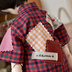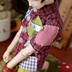 かわいいチェックシャツにちいさくカットしたはぎれたちをペタペタ縫い付けました、古着風でかわいいシャツです。 おしゃれ好きな女の子も、かわいいものが好きな男の子にも◎❣️ アウターを重ね着したり、下に薄手のロングTシャツを着込んだり?!もちろん1枚でもすっごくかわいい♩ いろいろコーデたのしんでね♡⃛ ボタンは飾りで、スナップボタンで留めて着せます。