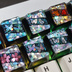 四季をモチーフに、日本の伝統工芸である螺鈿細工風のキーキャップを制作しました。パズルのように一枚一枚緻密に並べられたシェルの欠片と蝶のホログラムは、偏光効果で見る角度や光の当たり具合により、様々な色味に変化します。 下部分には青色の、上面には蝶に合わせた色の微粒子パウダーを散りばめました。 基本カラーのブルーベースと、モチーフの蝶に合わせたグリーンベースのシェルカラーバリエーションがあります。 プロファイルはおおむねOEM R1, Cherry MX互換軸に対応しています。 安心BOOTHパック ネコポスでお届けします。(送料370円)