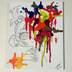 キャンバスに溶かしたクレヨンを垂らした後、鉛筆やクレヨンで描きあげました。