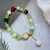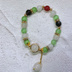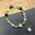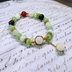 ホタルをイメージした天然石ブレスレットです。 薄緑と白をメインに一部に金色と黒、炎の赤を混ぜたデザインとなっております。 撮影状況により、画像と実物の色合い等に違いが出る場合があります。 ご不明な点はお気軽にお問い合わせください。 マグネット金具式となっていますが、外さなくても着用可能となっています。 内径:約17cm 金具の色;ゴールド *ご注意* *素人によるハンドメイド作品です。 *ハンドメイド作品ですので、同じ品を複数ご購入頂いた場合でも少しずつ個体差がある場合があります。 *金属を使用しております。金属アレルギーの方のご着用はご注意ください。 *一つ一つ丁寧に作成しておりますが、既製品と比べて強度や完成度が劣る場合がございます。ご了承の上お取り扱いにはご注意ください。 *水濡れや直射日光の当たる場所に放置しますと劣化が早まる恐れがありますのでご注意ください。