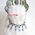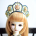ロシア民族衣装の頭飾りココシニクをイメージして作ったカチューシャタイプのティアラ (後ろ飾り付) 写真のモデルは頭囲18cmのドールで撮影しています。(カチューシャ部分は少し調節出来るようになっていますが、強い力を加えると変形する事があるので力を入れすぎず調節して下さい。) そのままカチューシャのように頭に飾ったり両サイドの輪っか部分に後ろ飾りをかけて使用出来ます。(写真1〜3枚目は後ろ飾りは装着していない状態です) 珍しい国産ガラスビーズを使用しているので光のある場所だとビーズの色が偏光して綺麗です。後ろ飾りも紺色のビーズに合わせて制作しています。 サイズ:高さ3.8cm 最大横幅8.3cm カチューシャ部分6.2cm 後ろ飾り11.8cm 注意:商品にドール・衣装、ウィッグ、ネックレスは含まれません。 ※販売・展示中のオリジナルの作品について デザインの著作権は放棄しておりませんので 画像・作品のデザインの転載及び流用はご遠慮願います。