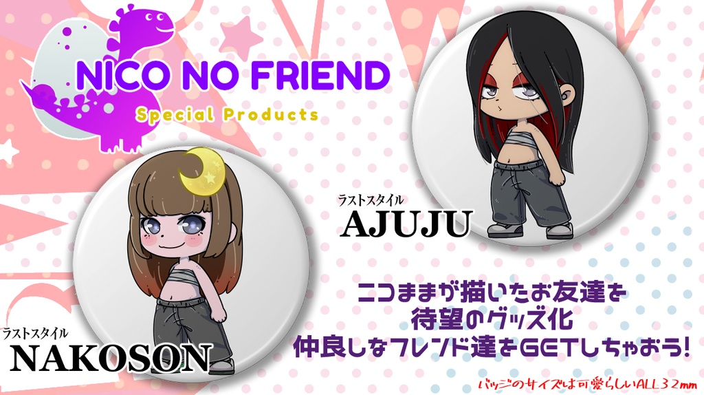 NICOMAMAと一緒に遊んだフレンズたちを待望のグッズ化! みんなの推しは誰かな? 小さいサイズのバッジなので、こっそり推し活しちゃいましょ♪ 販売されているキャラクター本人様には販売に関する許諾を頂いております。 ※予告なく販売終了する場合があります。