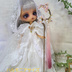 白い布から花びらや葉っぱを切り出して染めていきコテを当てて花の形に仕上げていく布花という技法で作った魔法の杖です。 今回は桜の花をモチーフにしました。 1センチと小さい花びらを中心が濃いピンクになるように染め、1つ1つにガクを付けて、小さいながらも桜だと分かるように作りました。 桜が爛漫と咲き誇る美しさを感じ取って貰えたら嬉しいです。