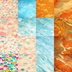 ### 商品概要 「多彩な模様とテクスチャ素材パック」は、合計14種70枚の高解像度画像を収録した素材パックです。このセットには、オレンジ色のマーブル模様背景やターコイズブルーのマーブル模様といったシーンが含まれています。