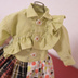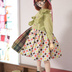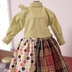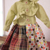 ライトグリーンのダンガリー無地生地と柄物生地を合わせてワンピースをつくりました。 腰から肩にかけての斜めフリルが超~かわいさ急上昇↗️な仕上がりです。 古着テイストの服がお好きな方や、個性的なワンピースをお探しの方にも✳︎ 大満足まちがいなし★★★★★のキュートな1枚です。 ボタンは飾りで、スナップボタンで留めて着せます。 袖は糸ループとボタンで開閉できます。