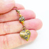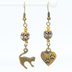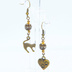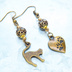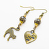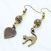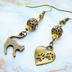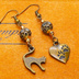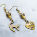アンティークゴールド 跳ね猫と肉球ハートと組合せたアシンメトリーピアス メタルビーズ ラインストーン