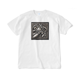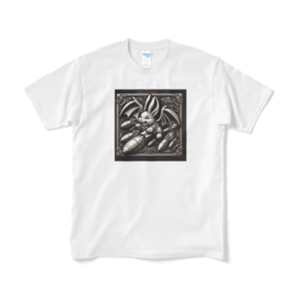 Tシャツ(短納期) - XL - ホワイトかわいらしいうさぎが、まるで小さな兵士のように元気に飛び跳ねながら爆弾を発射する姿は、見ているだけで心が和みます。真っ白なふわふわの毛並みと大きな丸い目で、私たちの心に癒しを届けるこのウサギ。 この商品はpixivFACTORYで作られた商品です。サンプル画像は完成イメージのため、実物と異なる場合があります。