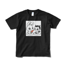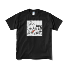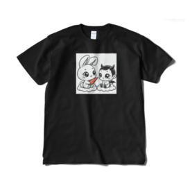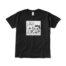 Tシャツ(短納期) - XL - ブラックふんわりとしたウサギとちょっと悪戯っぽい悪魔の赤ちゃんが、愛らしいハーモニーを奏でています!この二人はまるで親友のような存在。ウサギの愛らしい目と悪魔のちょっとクールな雰囲気が絶妙にマッチして、見ているだけで心が温まります。 この商品はpixivFACTORYで作られた商品です。サンプル画像は完成イメージのため、実物と異なる場合があります。