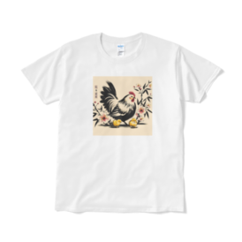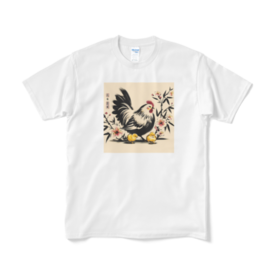 Tシャツ(短納期) - XL - ホワイトこの魅力的なシーンには、かわいいニワトリの親子が仲良くお散歩している姿が描かれています。鮮やかな羽色を持つ親鳥と、その後をついていく愛らしいひよこたち。その姿は見ているだけで心が和みます。 この商品はpixivFACTORYで作られた商品です。サンプル画像は完成イメージのため、実物と異なる場合があります。
