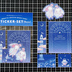 ジスター展にて描き下ろしたイラスト「巡る月夜の天使たち」をアレンジし、ステッカーセットを作りました。 スマホやノートデコのほか、耐水性ありの強粘着素材なので屋外の利用も可能です。 素材 : 光沢塩ビ【耐水】(強粘着) 内容量 : 5ピース サイズ : 最大で70×50mm ----------------------------------------------------- 【数量限定】ショップ内のいずれかの商品お買い求めの方に、クリアファイル(A5)をプレゼント中! 1回の発送で1枚おつけします。絵柄は商品画像の最後をご覧ください。 -----------------------------------------------------