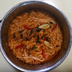 집에서 끓인 매운 라면. 파와 홍고추와 팽이버섯을 곁들인