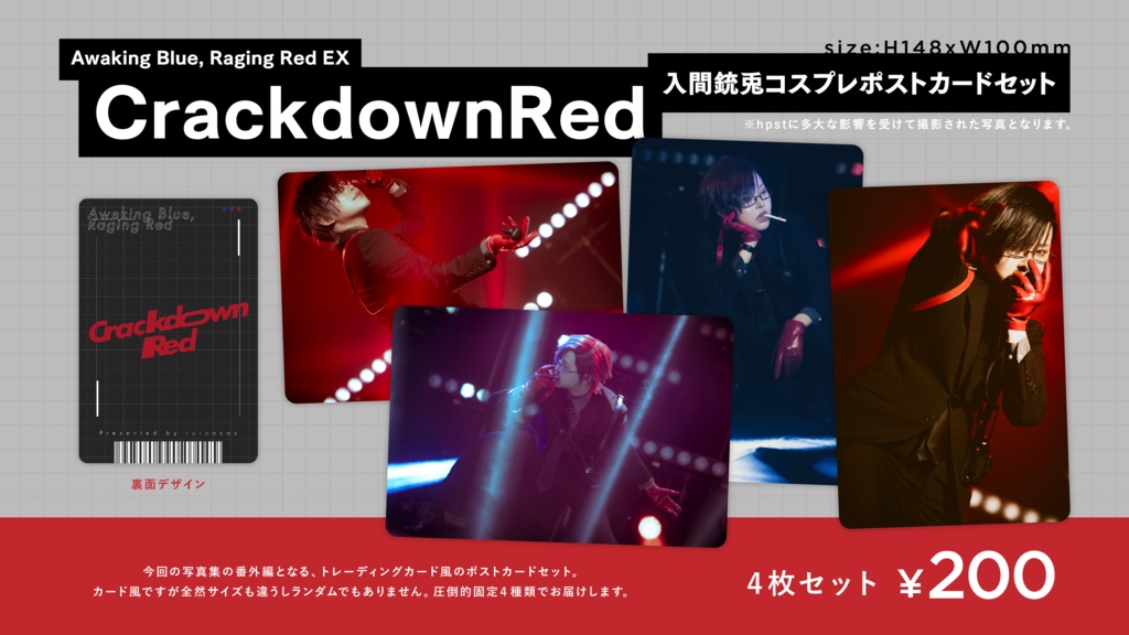 COMIC CITY SPARK 19ru-cocosCrackdownRed(入間銃兎コスプレポストカードセット)Shipping Date (Approx): 2024-10-27Ships within 3 daysOut of StockShips by Anshin-BOOTH-PackPhysical (direct)200 JPYRequest Restock Notice MailUnrequest Restock Notice MailAbout GiftH148xW100mm/両面フルカラー/表面クリアPP/4種セット 送料¥370(あんしんBOOTHパックのネコポスでの発送を予定) --- 今回の写真集の番外編となるポストカード4枚セットです。 トレーディングカード風ですが全然サイズも違うしランダムでもありません。内容はすべて同一です。 以前X(Twitter)に掲載した写真も一部含まれています。 ※hpstに多大な影響を受けて撮影された写真のため、お手に取られても問題のない方向けです。ru-cocosVisit FANBOX!SUPER COMIC CITY 32 TOKYOAcrylic Key Chain45Rabbit▼MD風偏光アクリルキーホルダーru-cocos500 JPYSUPER COMIC CITY 32 TOKYOCosplay PhotosOut of StockTracks(入間銃兎コスプレ写真集)ru-cocos1,000 JPYSUPER COMIC CITY 32 TOKYOCosplay (Other)本当に料理ができない人が料理ができない人のコスプレをしている本。REPLAY(入間銃兎中心MTCドキュメンタリーコスプレ写真集2)ru-cocos500 JPYCOMIC CITY SPARK 19StickersYKHMBuddies▼BIGクリアステッカーセットru-cocos500 JPYCOMIC CITY SPARK 19PhotosAwaking Blue, Raging Red(入間銃兎コスプレ写真集)ru-cocos500 JPYStickersOut of Stockハマのクリア連結ステッカー&箔押しチェキ風カードセットru-cocos300 JPYCOMIC CITY SPARK 18StickersThank you BoP2023ステッカーru-cocos100 JPYCOMIC CITY SPARK 18StickersOut of Stockはまのきらきらすてっかーせっと+ru-cocos300 JPYCOMIC CITY SPARK 18Cosplay Photos本当に料理ができない人が料理ができない人のコスプレをしている本。(入間銃兎中心MTCドキュメンタリーコスプレ写真集)ru-cocos700 JPYTOKYO FES Oct.2022StickersOut of Stockはまのきらきらすてっかーせっとru-cocos200 JPYTOKYO FES Oct.2022Cosplay PhotosIROIROIRUMA(入間銃兎コスプレ写真web再録集)ru-cocos1,000 JPYSUPER COMIC CITY 29Cosplay PhotosBlack And White(入間銃兎コスプレ写真集)ru-cocos1,000 JPYHARU COMIC CITY 30 ~30回記念~Cosplay PhotosHush up+(入間銃兎コスプレ写真集)【紙媒体版】ru-cocos500 JPYTOKYO FES Oct.2021Cosplay PhotosOut of Stock堅忍不抜(入間銃兎リンチコスプレ写真集)【DL版/乱丁本おまけ付き】ru-cocos100 JPYTOKYO FES Oct.2021Cosplay PhotosOut of Stock腹が減っては戦はできぬ(MTCコスプレ写真集)ru-cocos500 JPYCosplay PhotosHushup オソウジイルマ再録集(入間銃兎コスプレ写真集)ru-cocos0 JPYSee More