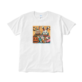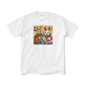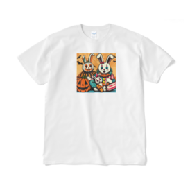 Tシャツ(短納期) - XL - ホワイトこの魅力的なハロウィンのシーンでは、かわいいピエロのウサギの親子が楽しげに登場!鮮やかな衣装をまとった彼らの姿は、まさにハロウィンの魔法を感じさせます。 この商品はpixivFACTORYで作られた商品です。サンプル画像は完成イメージのため、実物と異なる場合があります。